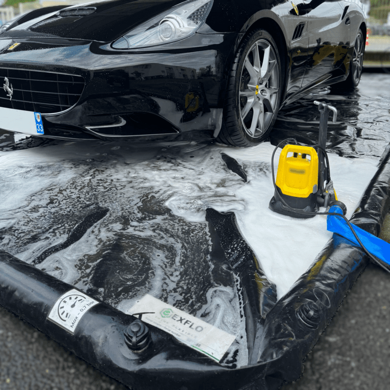 O tapete Exflo protege contra derramamento de água com detergentes e facilita sua coleta em recipientes apropriados. Também pode ser utilizado na garagem para limitar a propagação de lama e neve. Para aumentar a proteção contra danos mecânicos, o tapete pode ser equipado com faixas adicionais.